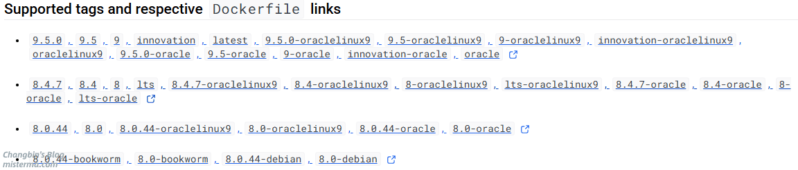在下载镜像前,你可以直接访问 Docker Hub 查找你感兴趣的镜像,镜像的页面会有版本说明,下面是 MySQL 的镜像版本说明: